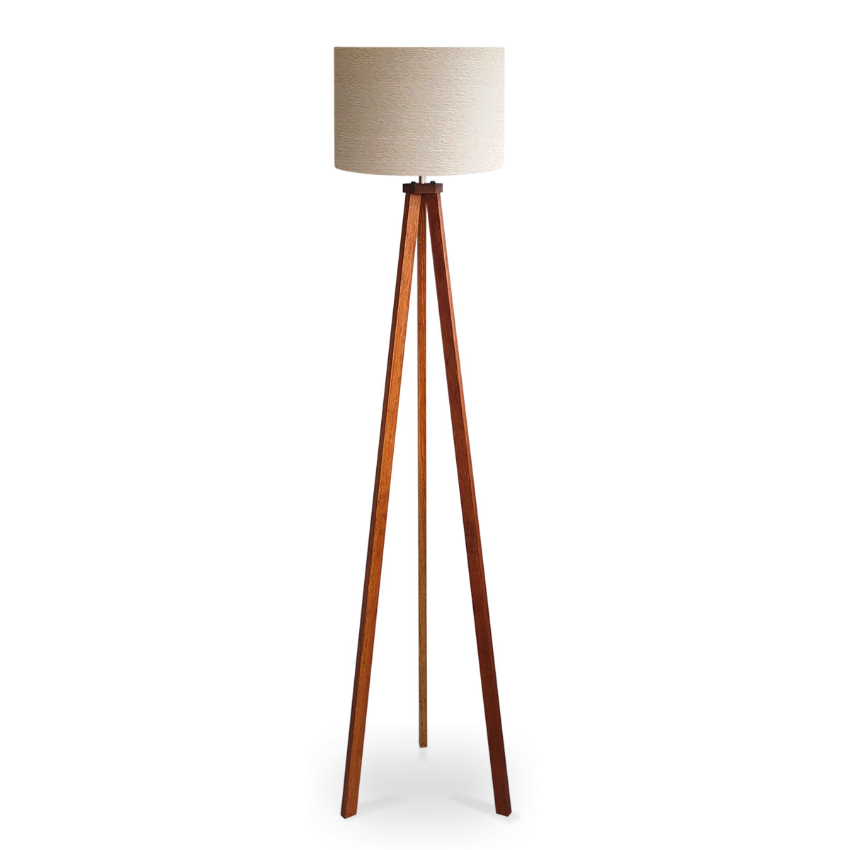 Luminária de chão Tripé, em madeira ecológica e cúpula em tecido revestida em acetato.