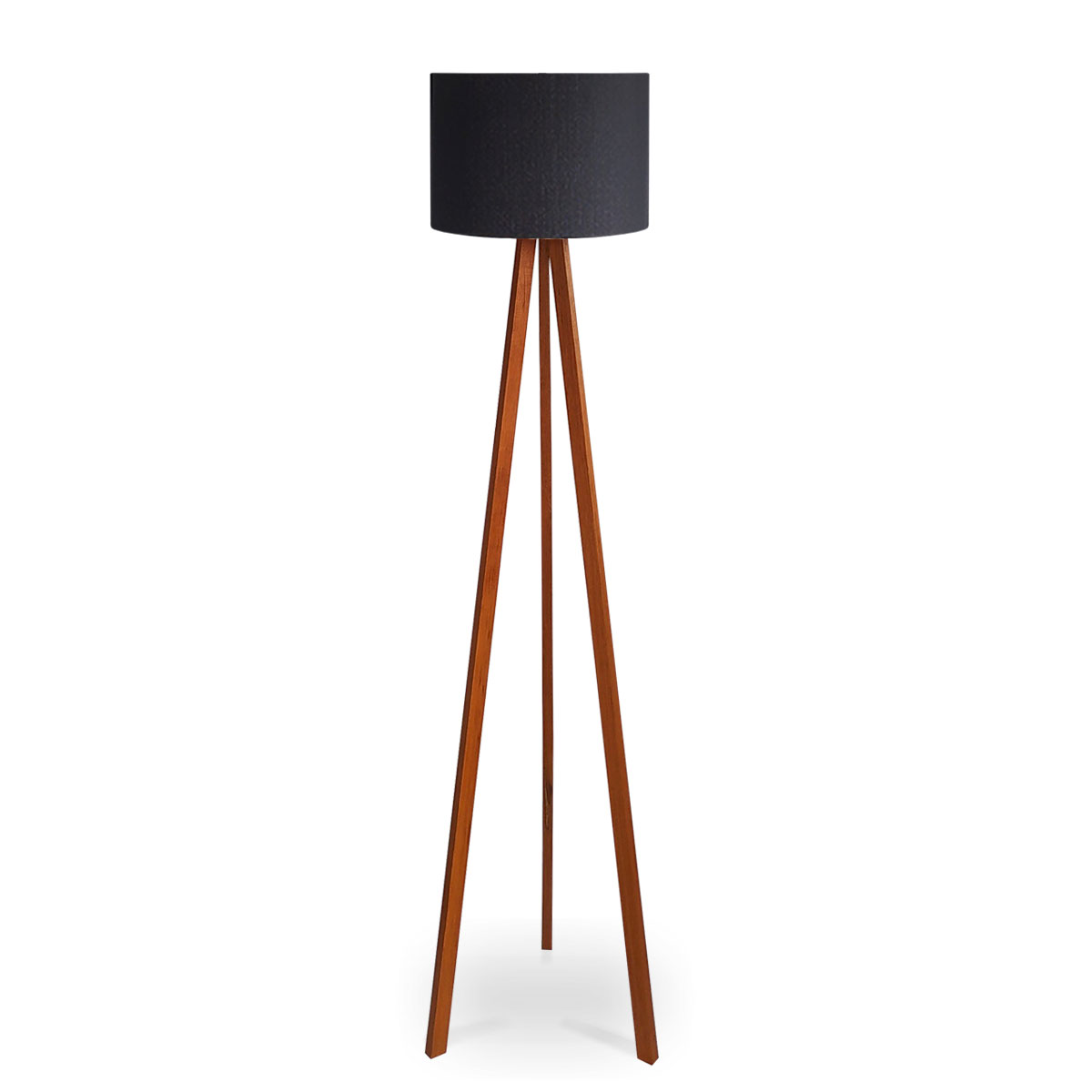Luminária de chão Tripé, em madeira ecológica e cúpula em tecido revestida em acetato.