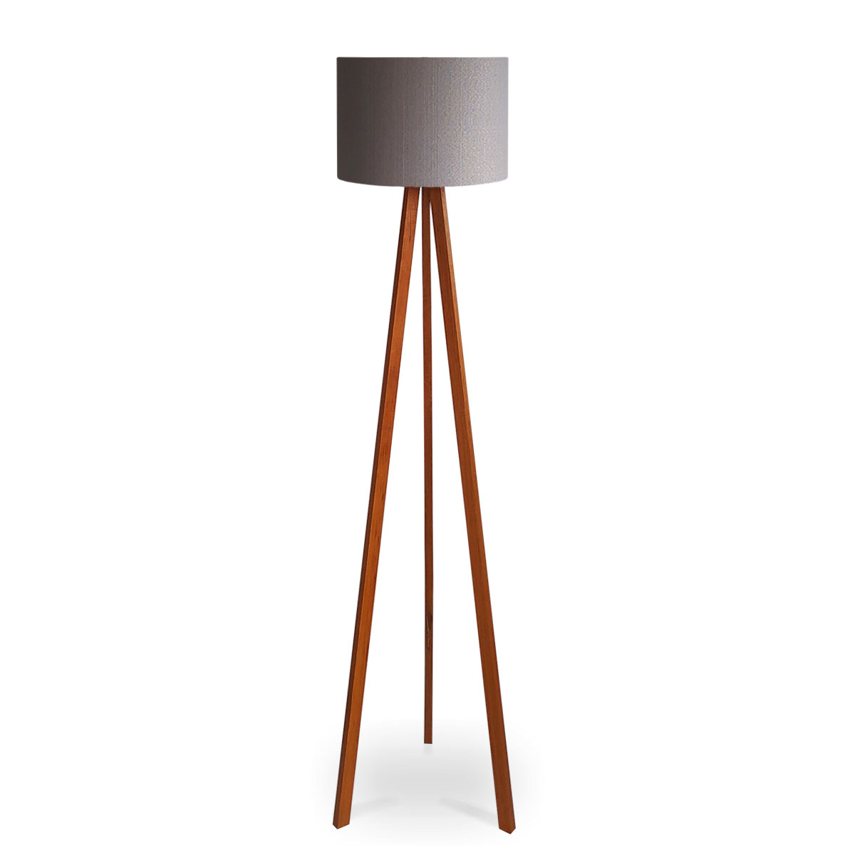 Luminária de chão Tripé, em madeira ecológica e cúpula em tecido revestida em acetato.